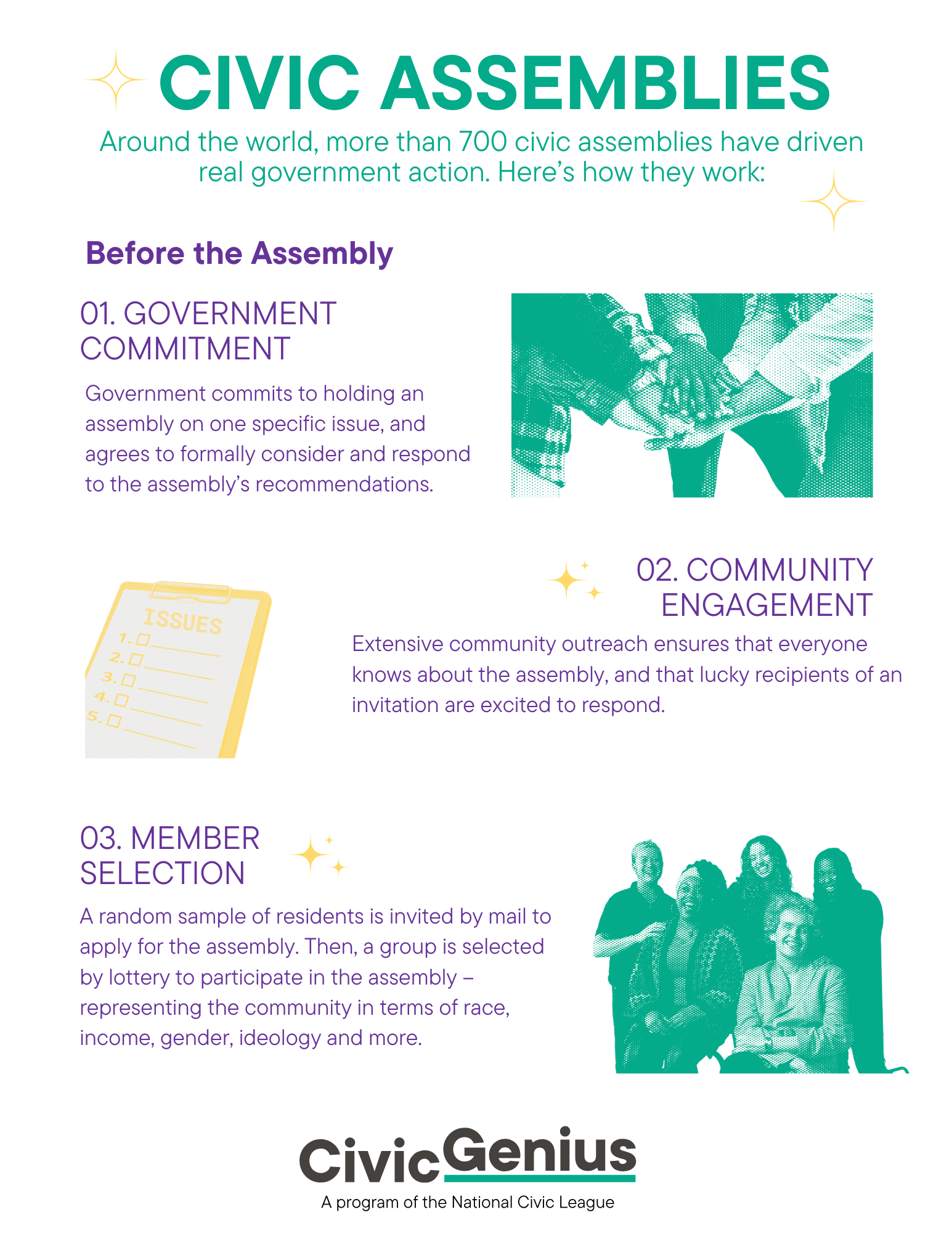 We’ve got your handy guide to the civic assembly process. Want to bring an assembly to your community? Reach out to us at iya@ourcivicgenius.org.